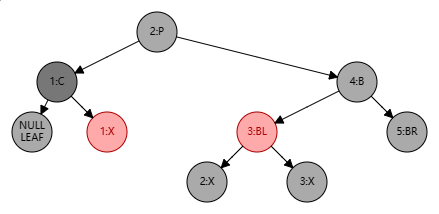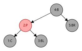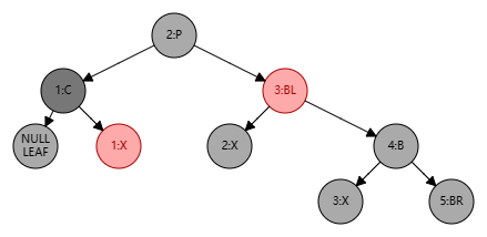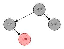 - 将 B 设置为 P 的颜色,以保持父结点的颜色不变,并将 P、BL 结点设置为黑色,此时局部整体满足黑色平衡并且黑色层高不变,无需再做自底向上处理;