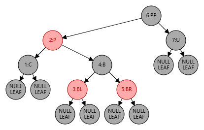 - 不过需要注意的是,此时 PP 整棵树的黑色层高也有增加了,所以我们还需要将 PP 结点设置为红色以此来保持 PP 树整体的黑色层高不变,于此同时需要将 PP 视作新的插入结点,做自底向上处理;