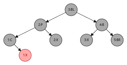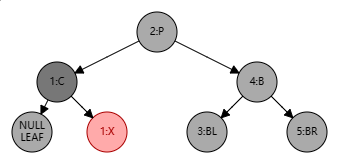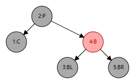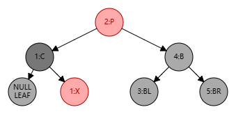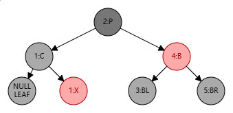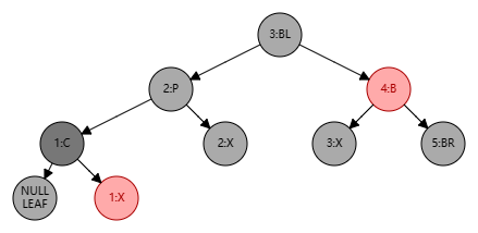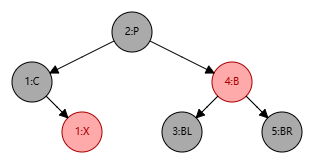 处理步骤:将 B 设为红色、P 设为黑色,此时局部整体满足黑色平衡并且黑色层高不变,无需再做自底向上处理。