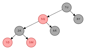 - 情景 2:若删除结点只有一个子结点(由性质 5 可知该子结点一定是红色结点),用子结点替换删除结点(相当于回到了情景 1);