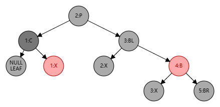 - 将 BL 设置为 B 的颜色,B 设置为红色,P 右子树对外界而言 “保持不变”,子结点的红色从原先的左边转移到了右边,至此我们得到了情景 BR:Red;