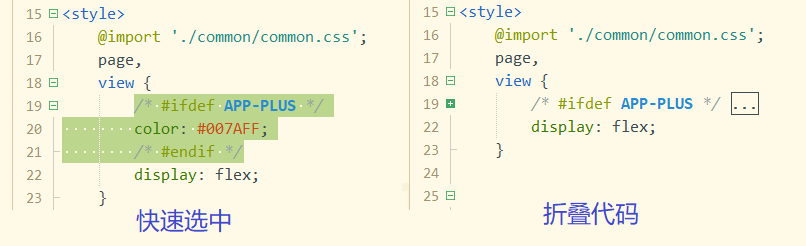 在 HBuilderX 中对条件编译的代码注释部分提供了语法高亮,可分辨出写法是否正确,使得代码更加清晰(独立 js 文件需在编辑器右下角切换 javascript es6+ 编辑器,独立 css 文件暂不支持高亮,但不高亮不影响使用)。