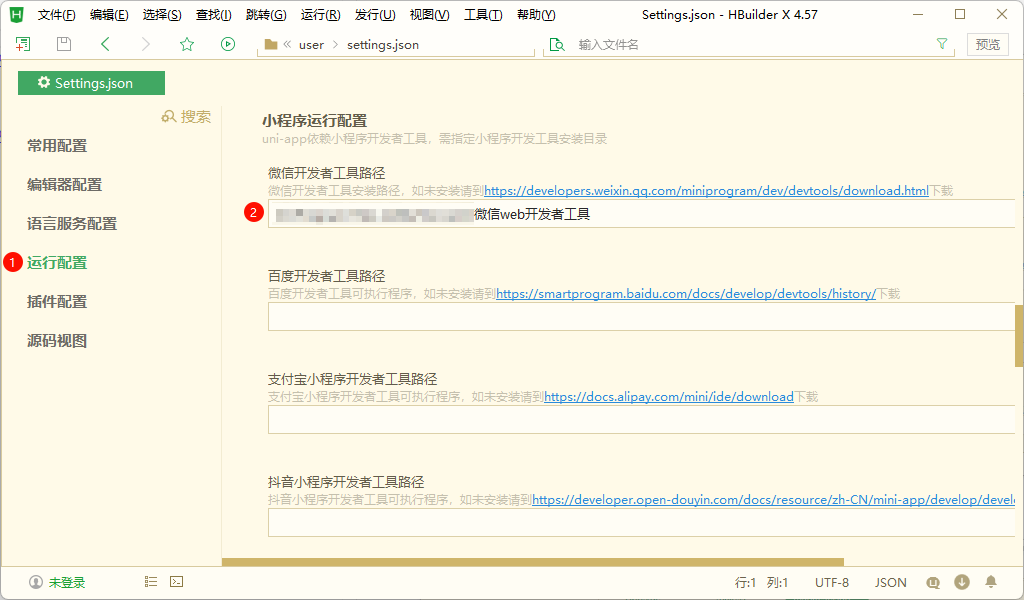 配置 HBuilderX 的微信开发者工具路径(“工具 -> 设置”,快捷键