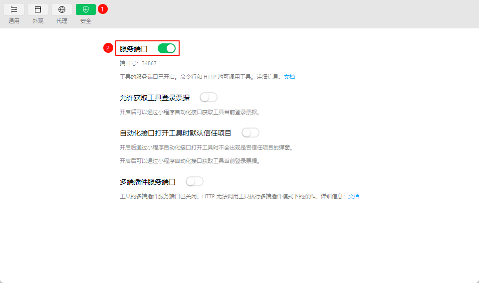 图 1.2 - 微信小程序 AppID 配置 在微信开发者工具中开启服务端口(“设置 -> 安全”):