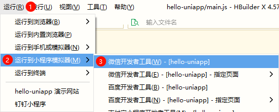 在 HBuilderX 中 “运行 -> 运行到小程序模拟器 -> 微信开发者工具” 运行小程序: