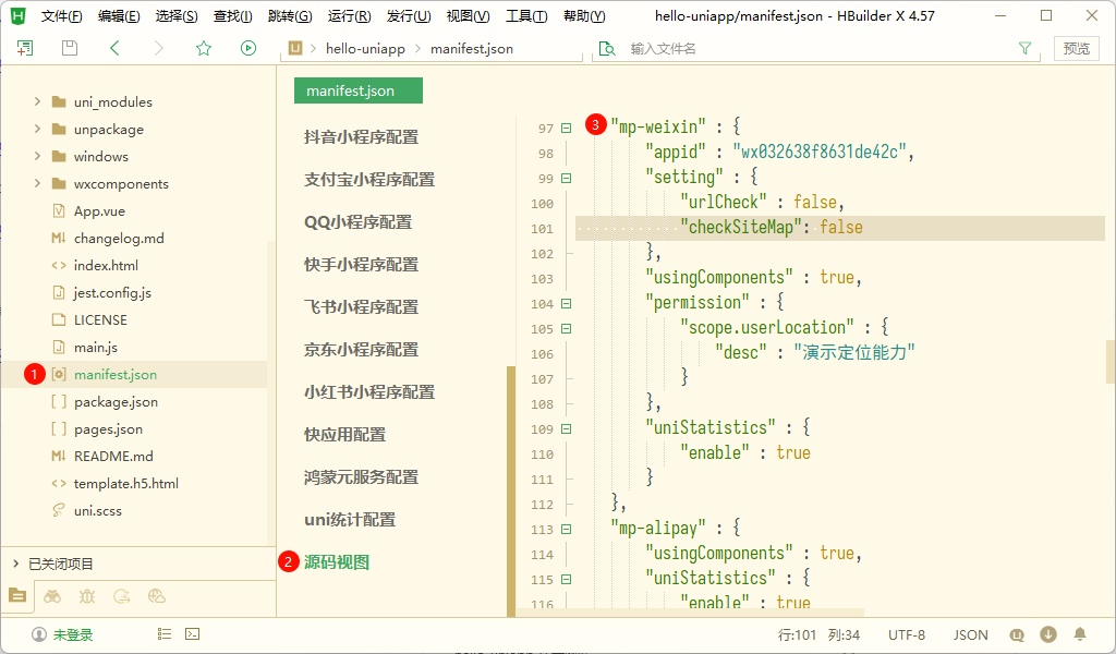 当需要修改微信小程序配置文件(project.config.json)时,可以在 UniApp 项目的 manifest.json 文件中进行配置。例如: