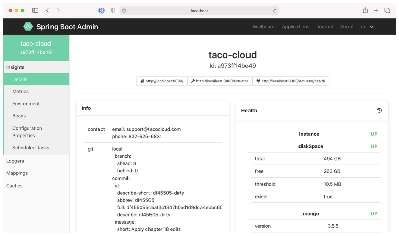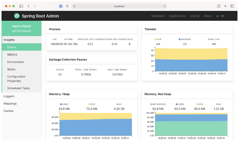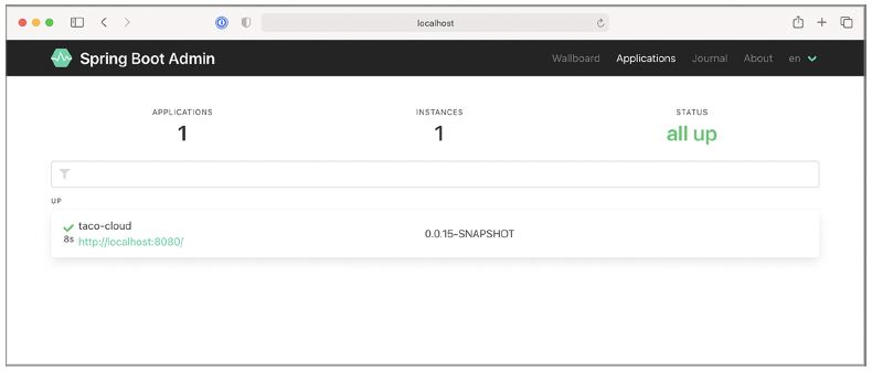 现在你已经将 Taco Cloud 应用程序注册到了 Admin 服务器,让我们来看看 Admin 服务器能提供什么。