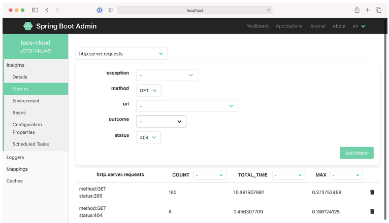在图 16.6 中,我在 http.server.requests 类别下的度量上设置了两个监视器。第一个监视器在收到 HTTP GET 请求并且返回状态为 200(OK)时报告度量。第二个监视器报告任何导致 HTTP 404 (NOT FOUND)响应的请求的度量。