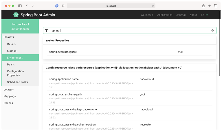 因为可能有数百个属性,你可以通过属性名称或值过滤可用属性列表。图 2.4 显示了通过名称和/或值包含 spring. 文本的属性进行过滤的属性。Admin 服务器还允许你使用 Environment Manager 下的表单设置或覆盖环境属性。