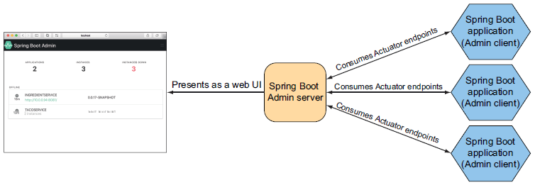 Spring Boot Admin 服务器从一个或多个 Spring Boot 应用程序中获取 Actuator 端点,并将数据以用户友好的方式展示在 Web 应用程序中;