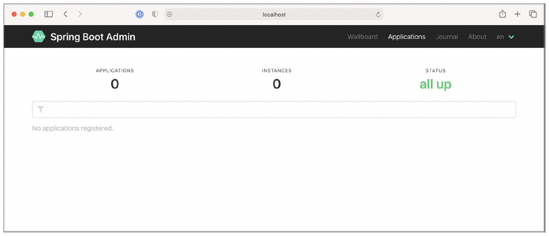 如你所见,Spring Boot Admin 显示零个实例的零个应用程序都已启动。所以接下来,你需要向其注册一些应用程序。
