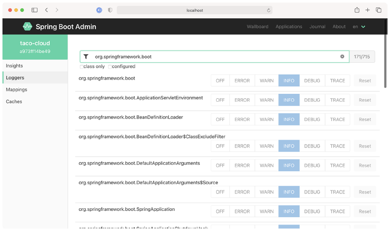Actuator 的 /loggers 端点有助于理解和覆盖正在运行的应用程序中的日志级别。Admin 服务器的 Loggers 视图在 /loggers 端点之上添加了一个易于使用的 UI,使管理应用程序中的日志变得简单。图 2.5 显示了通过名称 org.springframework.boot 过滤的日志记录器列表。