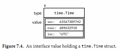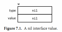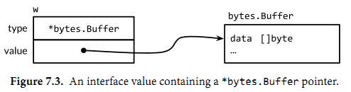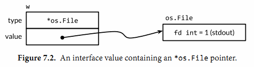 w和rw都持有os.Stdout因此它们每个有一个动态类型*os.File,但是变量w是一个io.Writer类型只对外公开出Write方法,而rw变量同时也会公开Read方法。Govar w io.Writer w = os.Stdout rw := w.(io.ReadWriter) // success: *os.File has both Read and Write w = new(ByteCounter) rw = w.(io.ReadWriter) // panic: *ByteCounter has no Read method1