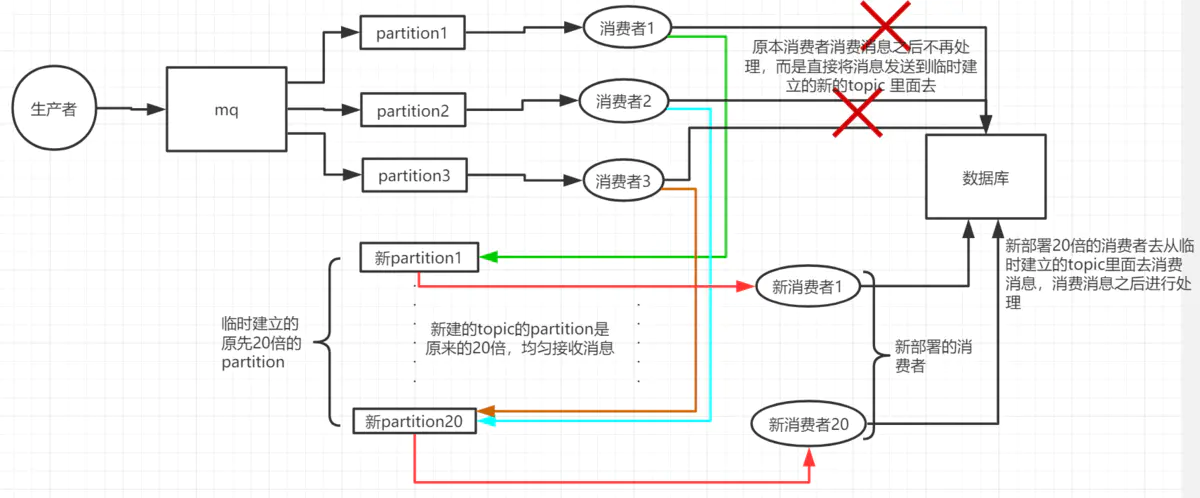 - 临时建立好原先 10 倍或者 20 倍的 queue 数量(新建一个 topic,partition 是原来的 10 倍);