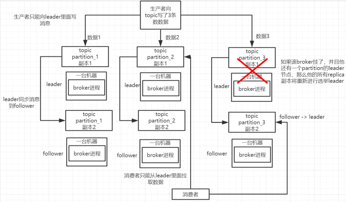 这样就是高可用了,因为如果某个 broker 宕机 了,没事儿,那个 broker 的 partition 在其他机器上有副本,如果这上面有某个 partition 的 leader,那么此时会重新选举出一个现代 leader 出来,继续读写这个新的 leader 即可。