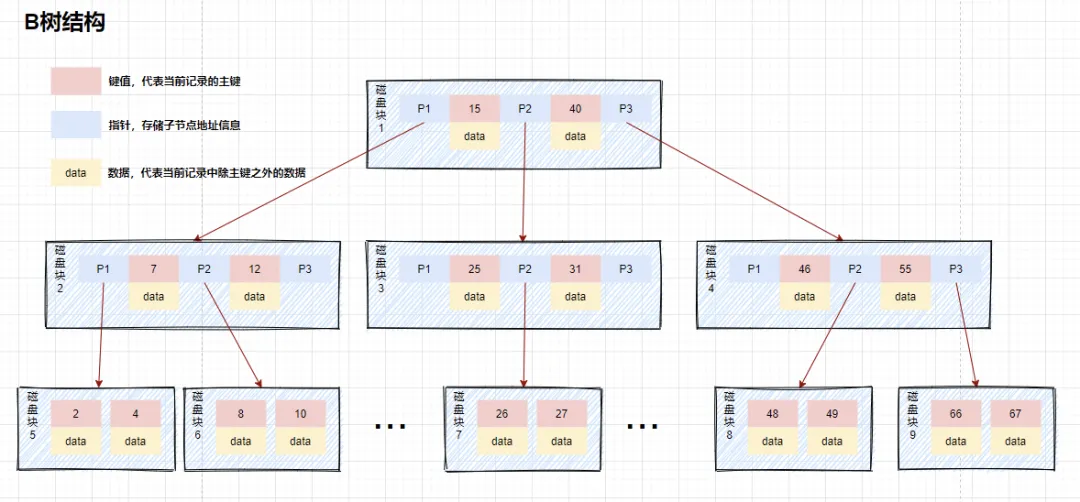 假如我们想要查找 9 和 26 之间的数据。查找路径是磁盘块 1 -> 磁盘块 2 -> 磁盘块 6 -> 磁盘块 7: