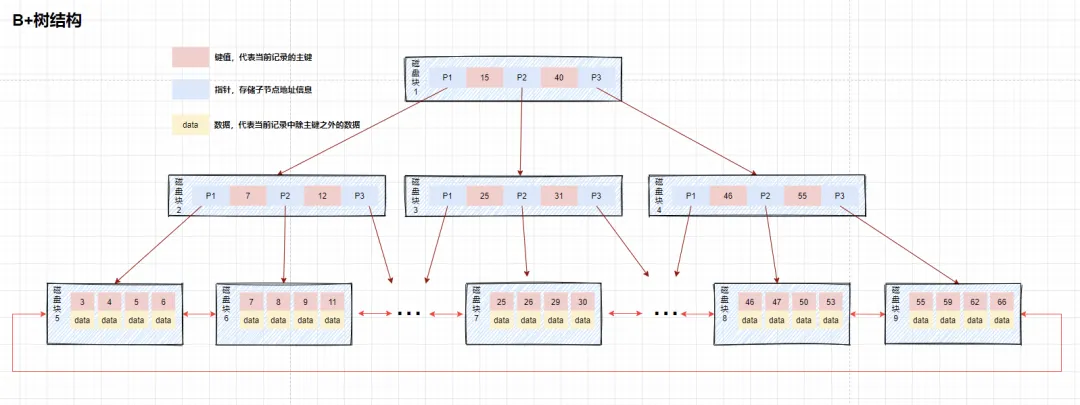 B+ 树:只有叶子节点才会存储数据,非叶子节点只存储键值。叶子节点之间使用双向指针连接,最底层的叶子节点形成了一个双向有序链表。