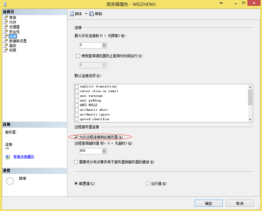 在打开的属性窗口,在其右边点击 “连接”,然后再左侧勾上 “允许远程连接到此服务器”: