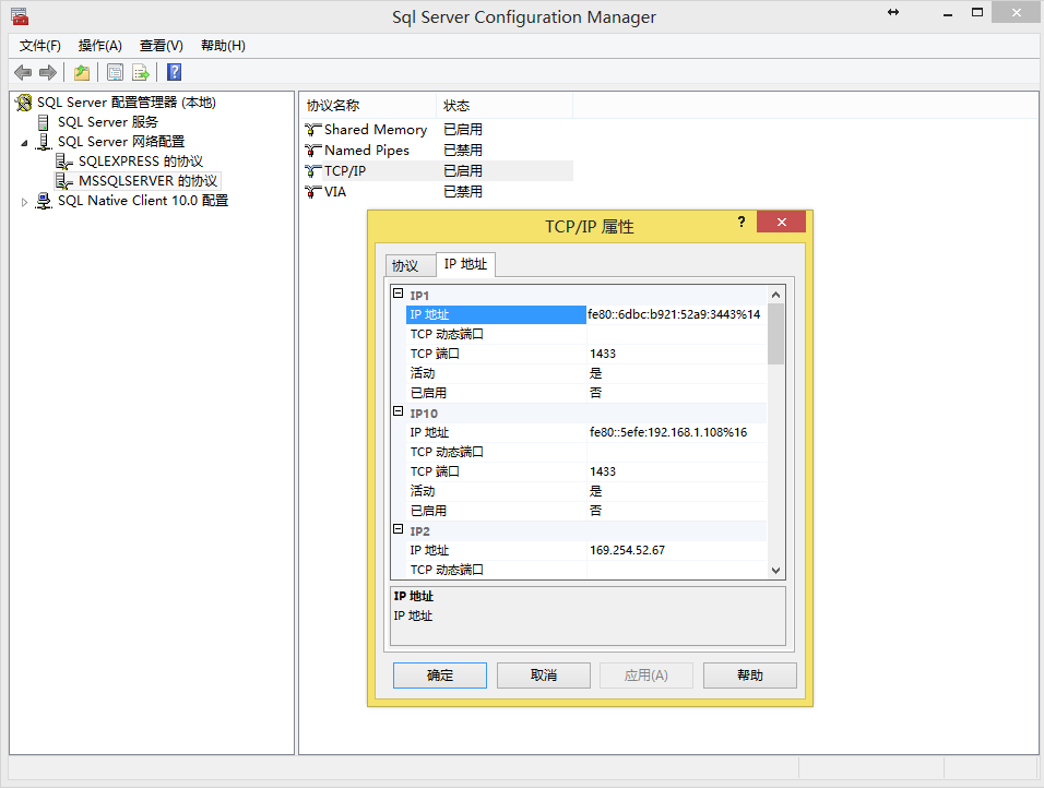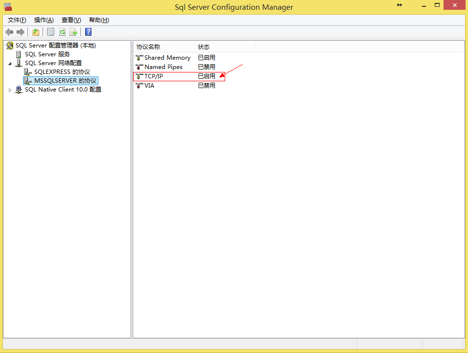 打开 SQL Server 配置管理器后,选择 SQL Server 网络配置下面的 MSSQLSERVER,然后看右边里面的 TCP/IP 是否为 “已启用”,如下图所示: