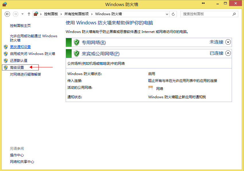 从上图中我们可以看出,这台 SQL 服务器上支持 TCP/IP 协议的是 1433 端口。下一步要做的是在防火墙的配置中允许 1433 端口支持 TCP/IP 协议即可。如果服务器上运行的是 Windows 7 操作系统,其配置步骤为(其他微软操作系统的做法类似),打开 “控制面板” 选择 “Windows防火墙” 选项,然后点击高级选项,如下图所示: