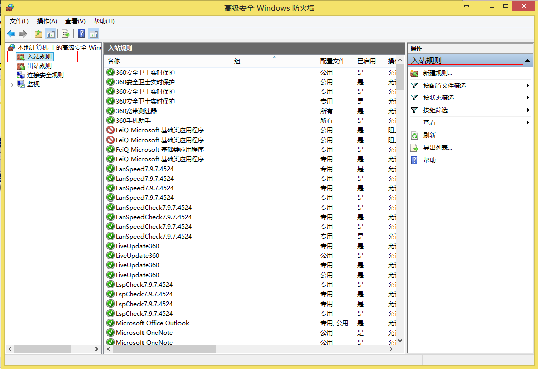 选择 “高级设置” 后,在右边菜单栏中找出 “具有高级安全选项的 Windows 防火墙” 并将其打开。打开后会发现在左边菜单栏中有 “入站规则(Inboud Rules)” 选项。将该选项打开,并在右边菜单栏中选择 “新建规则(New Rule)” 选项: