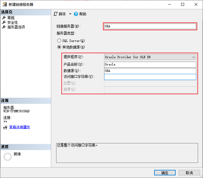 Oracle Provider for OLE DB 访问接口选项 右键 “链接服务器” 选择 “新建”: