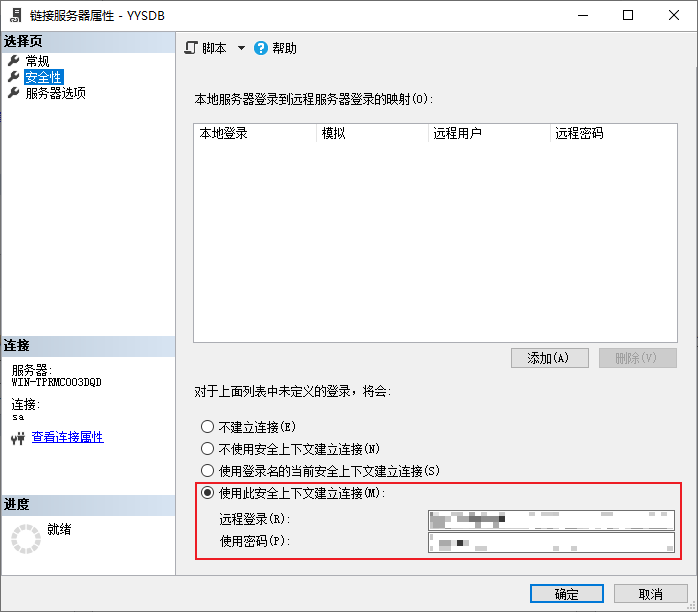 新建链接服务器 - 常规 随后再切换至 “安全性” 选项卡,并输入连接到 Oracle 数据库的账号、密码: