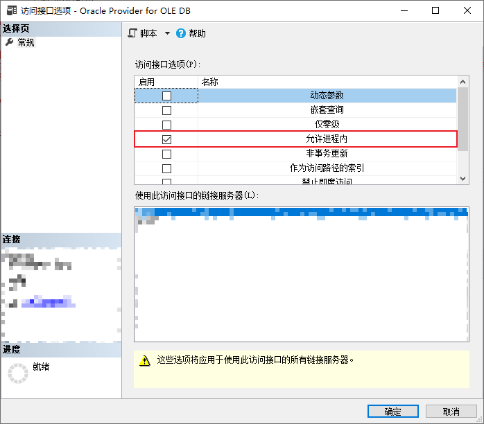 OraOLEDB.Oracle 确认 Oracle Provider for OLE DB 的访问接口选项有勾选了 “允许进程内”: