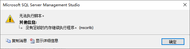 往 SQL Server 中导入大量数据时,若 SQL 文件较大,直接在 SSMS 中执行时会提示 “没有足够的内存继续执行程序”: