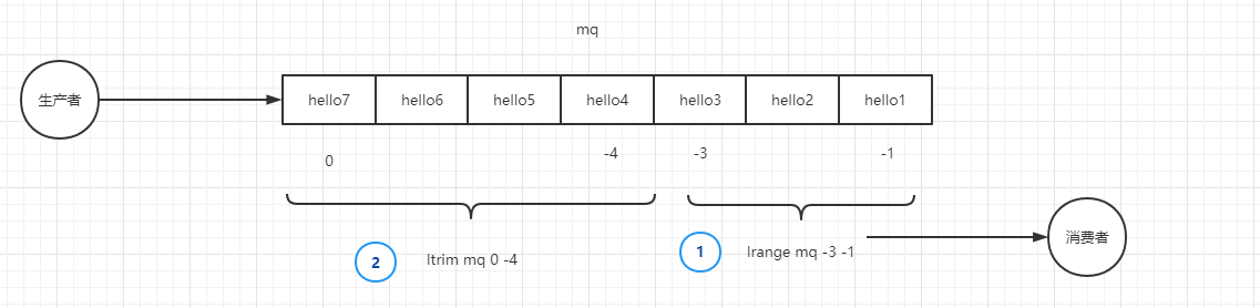 Bash127.0.0.1:6379> lrange mq -3 -1 1) "hello3" 2) "hello2" 3) "hello1" 127.0.0.1:6379> ltrim mq 0 -4 OK 127.0.0.1:6379> lrange mq 0 -1 1) "hello7" 2) "hello6" 3) "hello5" 4) "hello4"1