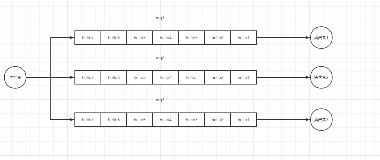 这里只需要维护一个消费者和消息队列名称映射的列表,生产者发送消息时发送给所有的消费者对应的队列。消费者读取自己对应的消息队列。