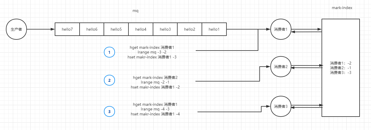 127.0.0.1:6379> lpush mq hello6 hello73.1.2. 消费者读取消息