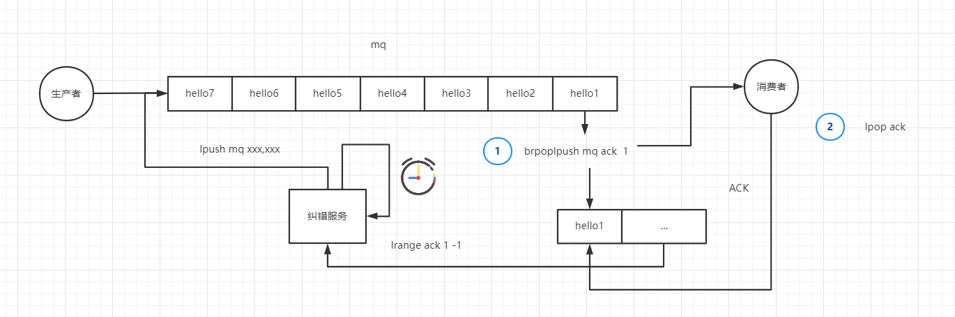 再启动一个线程,作为纠错服务。定时读取 ACK 队列第二个元素及其之后的元素,重新推入 MQ,进行消费。这样可以有效的防止消息丢失。