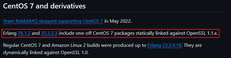 图 1.3 - CentOS 7 一次性软件包 Erlang 26.1.2 和 25.3.2.3 版本为 CentOS 7 提供了一次性的包,这些包与 OpenSSL 1.1.x 静态链接。也就是该 Erlang 包在编译时,将 OpenSSL 1.1.x 版本的库直接嵌入到了可执行程序中。