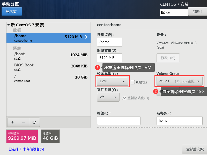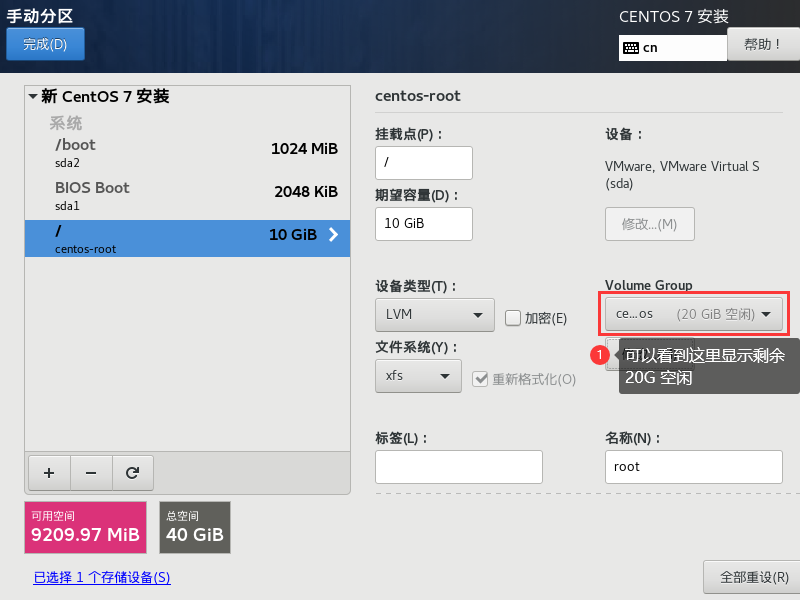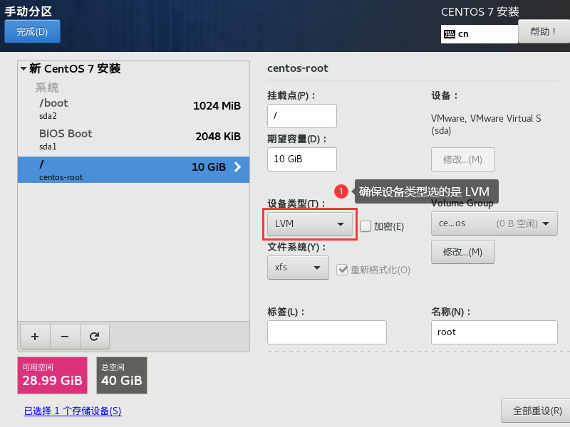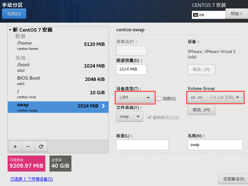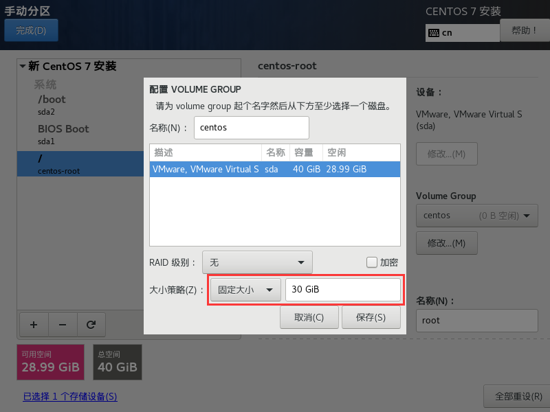 LVM 预设会取一个名为 centos 的 LVM 装置,此项可以不用修改。但是在这里我们将其修改为固定容量大小(30G)。