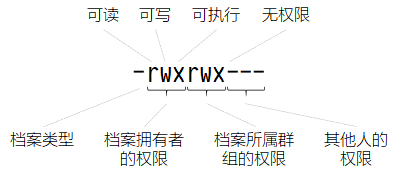 r、w、x 对应的数值分别是 4、2、1,以 “-rwxrwx---” 权限为例: owner = rwx = 4 + 2 + 1 = 7 group = rwx = 4 + 2 + 1 = 7 others = rwx = 0 + 0 + 0 = 0 所以 “-rwxrwx---” 对应的数字类型权限就是 “770” 啦。
