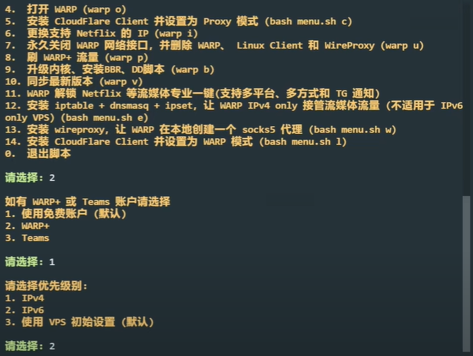 Bash$ wget -N https://gitlab.com/fscarmen/warp/-/raw/main/menu.sh && bash menu.sh [option] [lisence/url/token]执行完成之后,选择语言为中文: