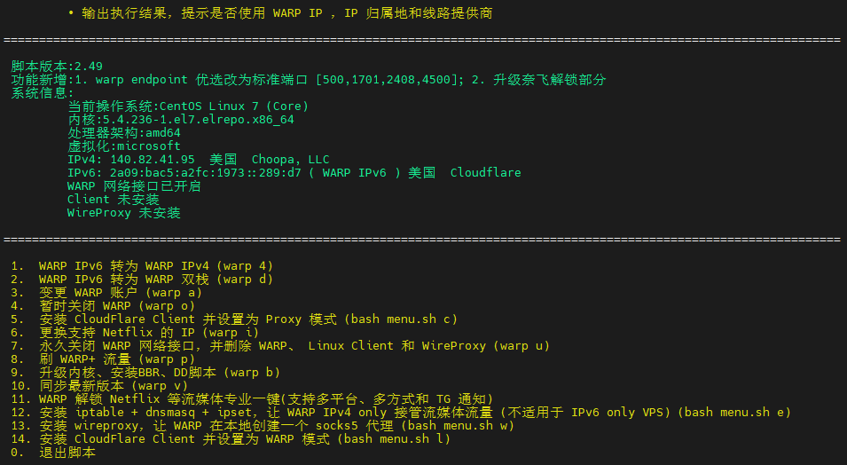 在完成以上安装步骤之后,后续不需要再重复执行以上脚本了。可以通过 warp [option] [lisence] 来管理 WARP(需要通过 root 账户执行)。