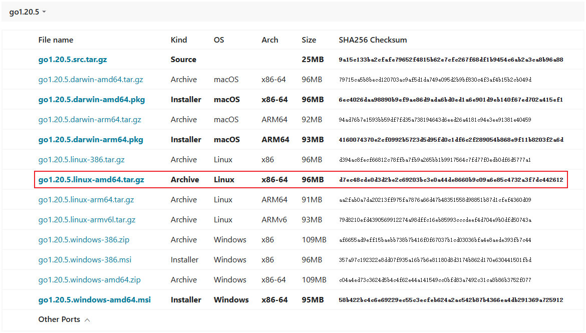 Bash$ sha256sum go1.20.5.linux-amd64.tar.gz输出: