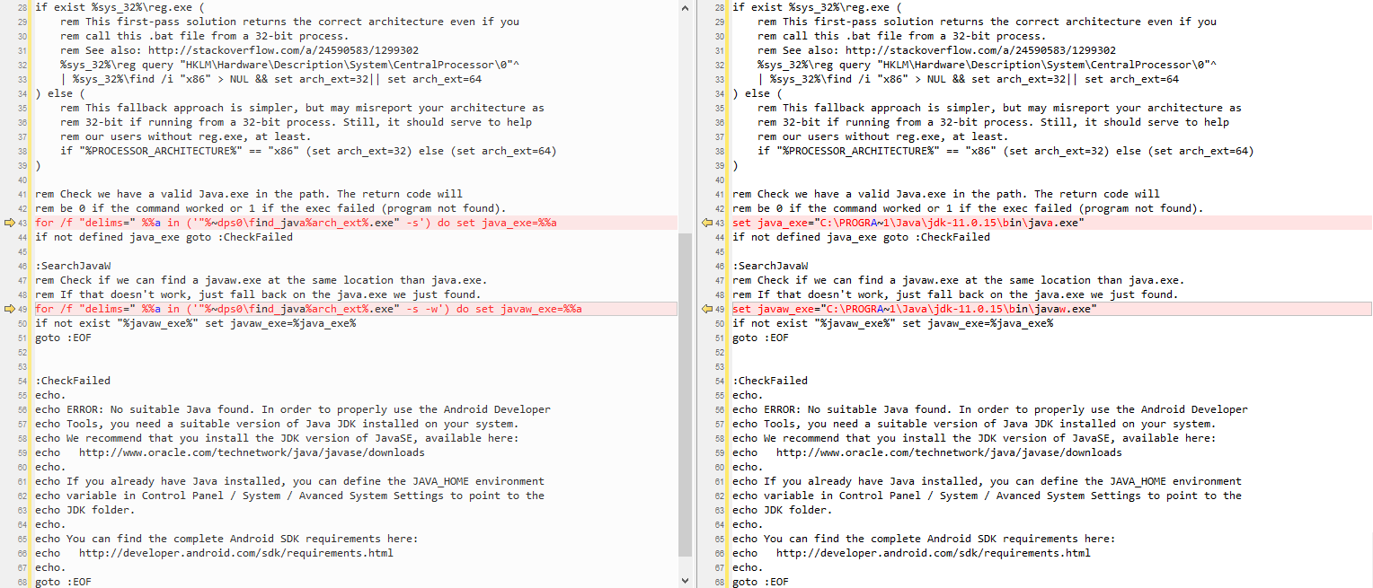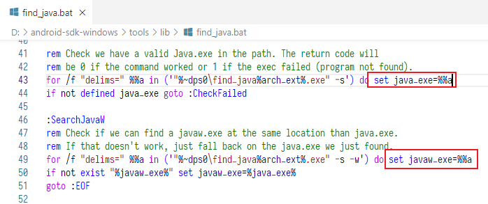 android.bat是通过.\lib\find_java.bat脚本来查找 Java 所在的目录的,用 VSCode 或其它文本编辑器打开.\lib\find_java.bat文件,找到以下这两段代码: