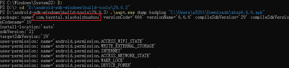 aapt命令:PowerShellPS C:\Windows\System32> D: PS D:\> cd "D:\android-sdk-windows\build-tools\29.0.3" PS D:\android-sdk-windows\build-tools\29.0.3> .\aapt.exe dump badging "C:\Users\a8201\Downloads\xbzs6.6.6.apk"1