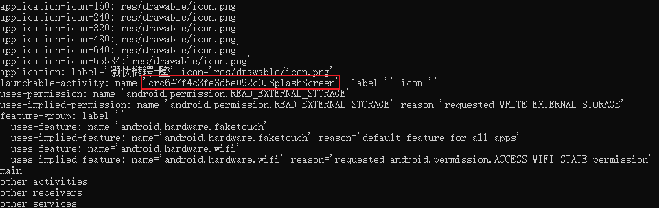 findstr直接查找目标字符串:PowerShellPS D:\android-sdk-windows\build-tools\29.0.3> .\aapt.exe dump badging "C:\Users\a8201\Downloads\xbzs6.6.6.apk" | findstr package package: name='com.baystal.xiaobaizhushou' versionCode='666' versionName='6.6.6' compileSdkVersion='29' compileSdkVersionCodename='10' PS D:\android-sdk-windows\build-tools\29.0.3> .\aapt.exe dump badging "C:\Users\a8201\Downloads\xbzs6.6.6.apk" | findstr activity launchable-activity: name='crc647f4c3fe3d5e092c0.SplashScreen' label='' icon='' PS D:\android-sdk-windows\build-tools\29.0.3>1