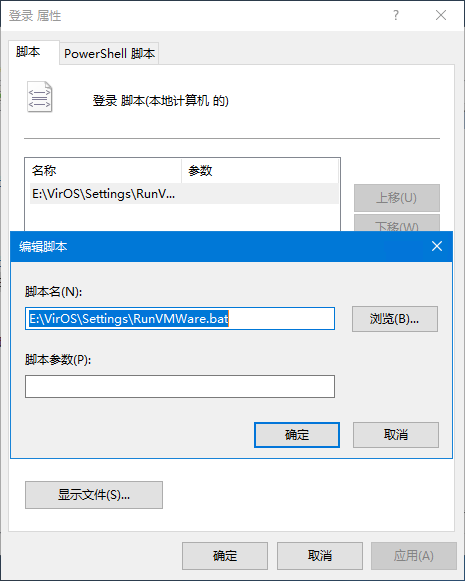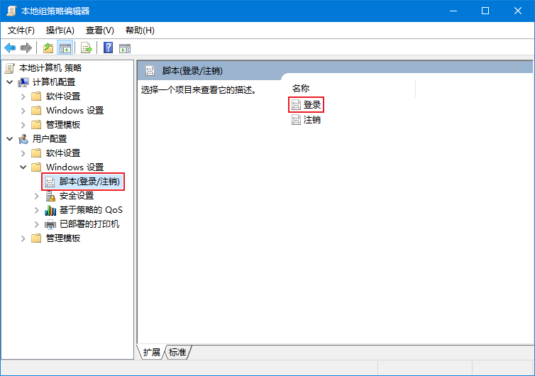 在组策略中,依次选择 用户配置 > Windows 设置 > 脚本(登录|注销),右边面板的 名称 下选择 登录