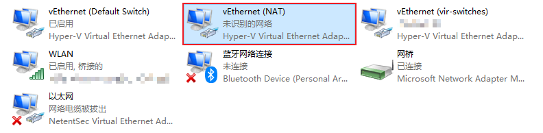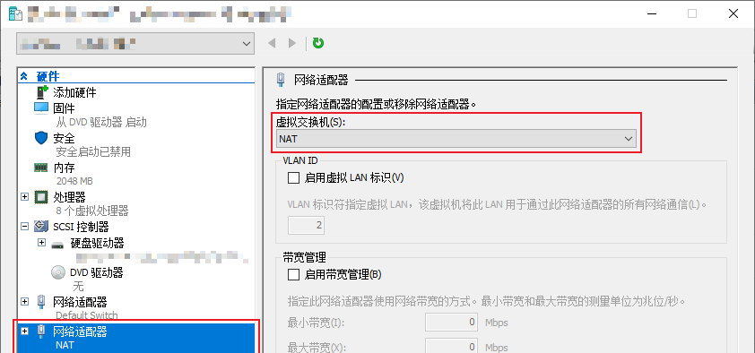 最终效果为:虚拟机一共有两块网卡,一块为默认的 Default Switch,一块为新加的 NAT: