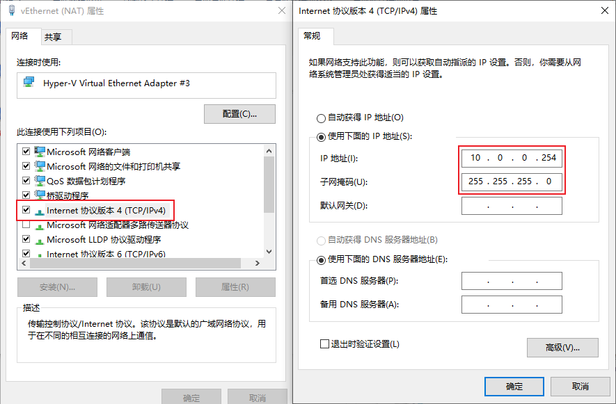 PowerShellNew-NetIPAddress -IPAddress 10.0.0.254 -PrefixLength 24 -InterfaceIndex $ifindex创建 NAT 网络(IP 地址记得换成自己的):