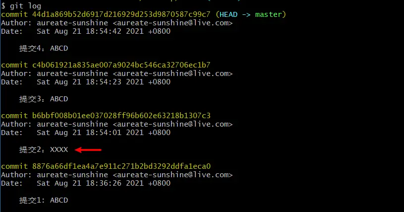 几个提交都很相似,唯独 “提交 2” 写错了,写成了 “XXXX”。我们希望把 4 个 Commit 的 Message 都写为 “提交 n:ABCD”。由于后面已经叠了两个 Commit,之前的 amend 方法不再适用。