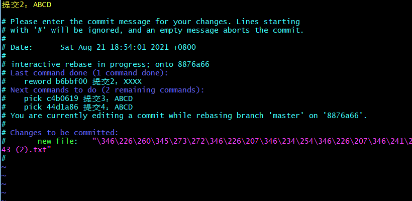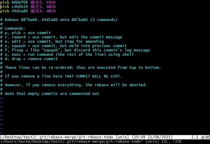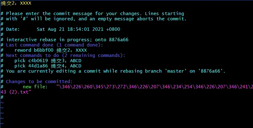 修改完之后,按 Esc 退出编辑,输入 :wq 保存并退出,之后就会进入 “提交 2” 的编辑界面。