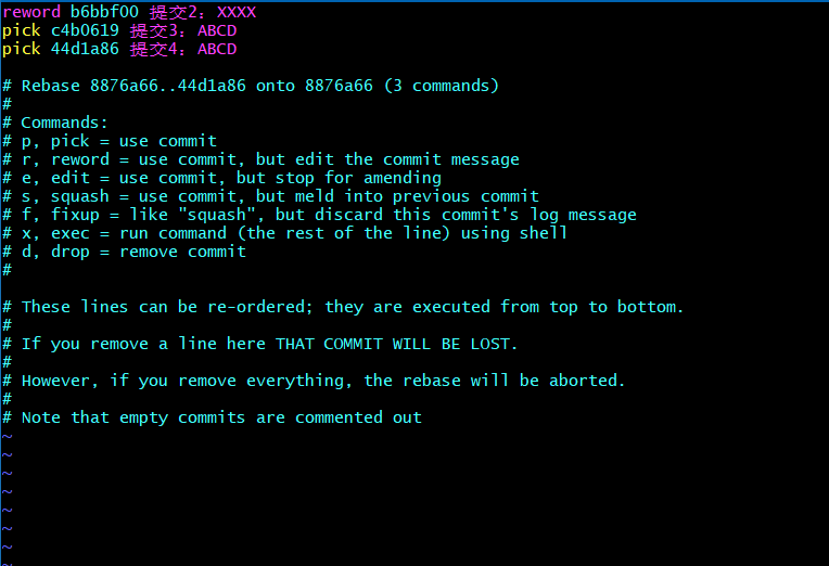$ git rebase -i 8876a66df1ea4a7e911c271b2bd3292ddfa1eca0进入 Vim 界面,在顶部可以看到提交 2,3,4 都可修改: